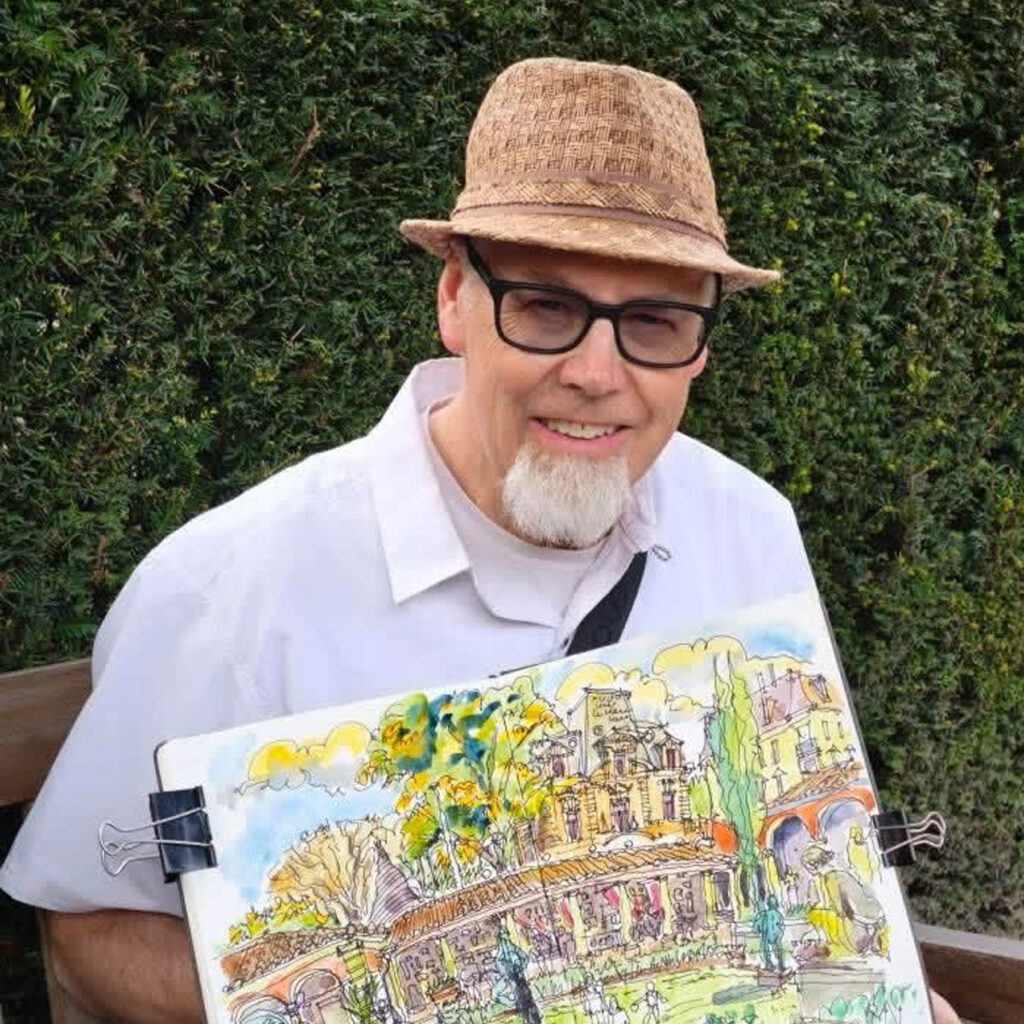 Traveling presents ideal opportunities to create lasting memories of your adventures. Photos are one way of recording the places, but sketching allows immersion into experiences and a chance to slow down. Activities enhance your memory of people/places/events and so I try to sketch while eating, drinking, talking, etc., adding to the enjoyment while embedding those memories. This workshop will share strategies to prioritize and capture sketches of the journey by using simplification techniques, loose sketching, and fast color washes to make the most of even just a few minutes available to sketch.